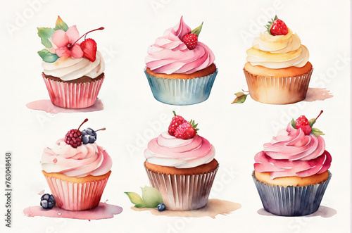 Set of watercolor cupcakes isolated on white background. Hand drawn watercolor illustration. AI generated