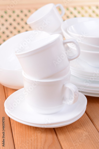 Set of white dishes on table on light background