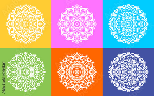 set of white mandala art round decorative texture design with multicolor background