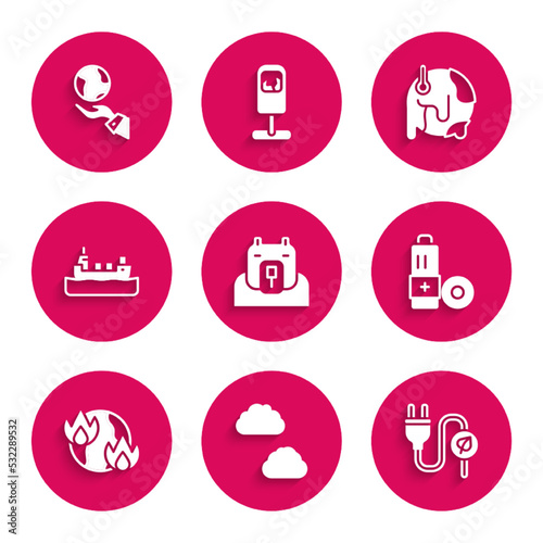 Set Polar bear head, Cloud, Electric saving plug in leaf, Battery, Global warming fire, Oil tanker ship, and Hands holding Earth globe icon. Vector