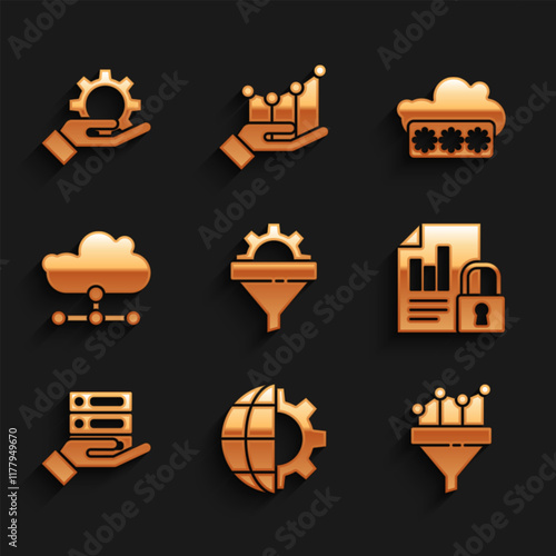 Set Sales funnel with gear, Globe of the Earth and, chart, Document lock, Server, Data, Web Hosting, Network cloud connection, Password protection and Hand settings icon. Vector