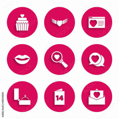 Set Search heart and love, Greeting card, Envelope with Valentine, Heart speech bubble, Diamond engagement ring, Smiling lips, Dating app online and Wedding cake icon. Vector