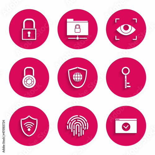 Set Shield with world globe, Fingerprint, Secure your site HTTPS, SSL, Key, WiFi wireless internet network, Safe combination lock wheel, Eye scan and Lock icon. Vector