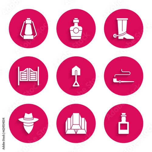 Set Shovel, Gold bars, Tequila bottle, Smoking pipe, Cowboy, Saloon door, boot and Camping lantern icon. Vector