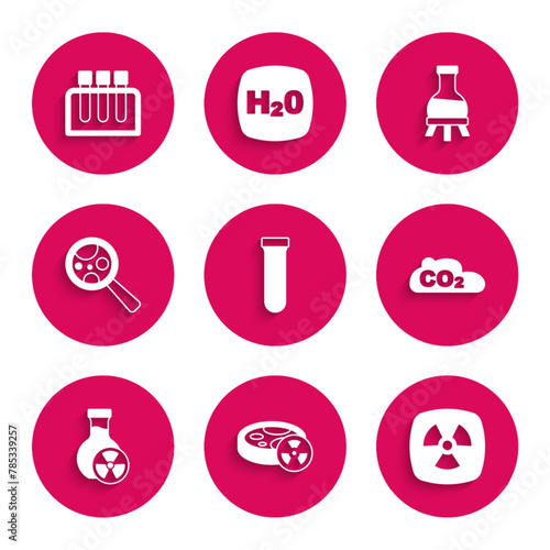 Set Test tube, with toxic liquid, Radioactive, CO2 emissions in cloud, Microorganisms under magnifier, and icon. Vector