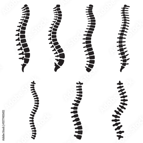 set vector various Spinal cord silhouettes , Spine Illustrations Showing Different Curvatures. Collection of Spinal Column Illustrations Anatomy Vertebrae