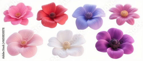 Seven Colorful Artificial Flowers on White Background