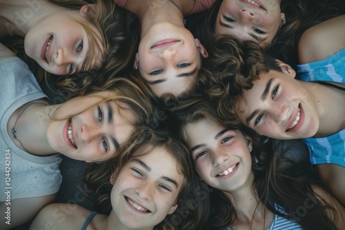 Seven teenagers lying in circle on floor, heads together, smiling and looking up
