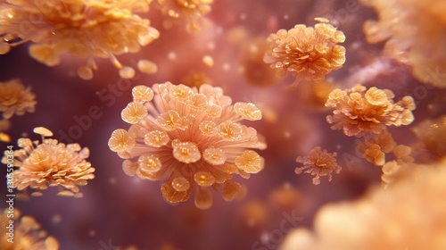Several abstract floral shapes float softly with warm orange and purple hues