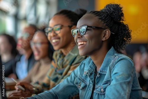 Several beautiful businesswomen and a man, sitting at a desk, smiling and laughing while wearing eyeglasses, watching an online presentation on the computer in a corporate office.
