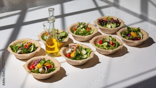 Several biodegradable bowls full of mixed green salad with tomatoes, cucumbers, onions, and other fresh vegetables, being prepared with olive oil by a chef in a restaurant kitchen