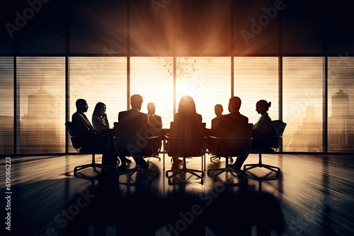 Several people at table gathered around conference table in style of silhouette lighting Generative AI illustrations