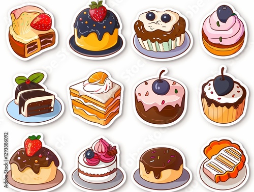 several stickers in 1 piece, knolling of minimalism style CUTE Cut Cakes, simplified method, no human, pocket stiker, vector image, icon design,