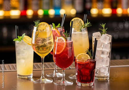 Several tall glasses filled with various cocktails are displayed on a bar top