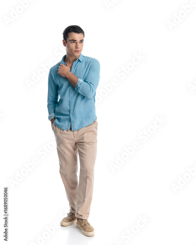 sexy confident man holding hand in pocket and adjusting blue jeans shirt