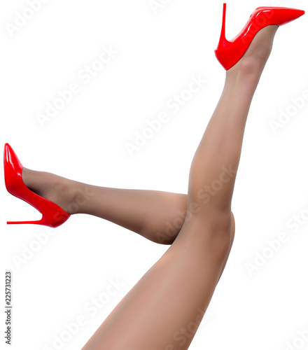 sexy female legs in red shoes and dark nylon pantyhose on a white background