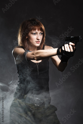 Sexy woman holding gun with smoke