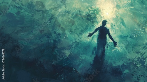 Shadow Figure Emerging from Turbulent Aqua Hues: A Vision of Overcoming and Hope