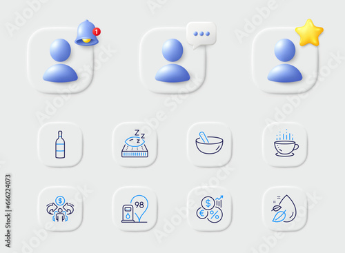 Sharing economy, Cooking mix and Mattress line icons. Placeholder with 3d star, reminder bell, chat. Pack of Inflation, Petrol station, Coffee cup icon. Wine bottle, Water drop pictogram. Vector
