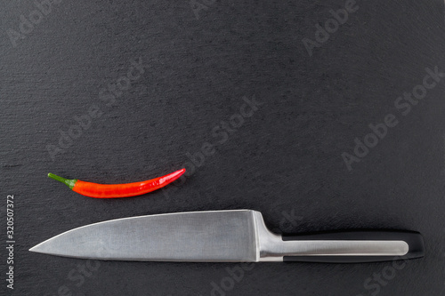 Sharp chef knife and fresh pod of red hot chili pepper on a black stone serving board. Mockup for menu design. Isolated on white. Copy space.