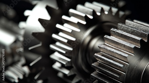Sharp focus on industrial gears showcasing metallic texture with intricate tooth patterns,