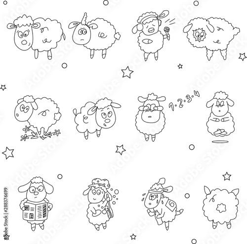 Sheep flat hand drawn vector black and white characters set isolated on white. Cartoon illustration