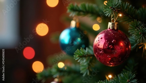 Shiny lights on a beautiful Christmas tree with colorful glass baubles, shining ornaments, winter tree decorations