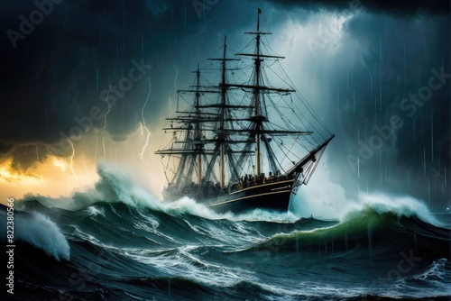 Ship Battling Rough Seas During Storm