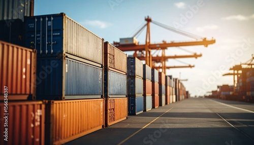 Shipping containers stacked at busy seaport terminal with cranes loading cargo