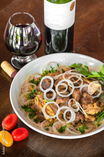 Shish kebab or shashlik with onion and dill. Pieces of mutton meat with vegetables, pepper and onion on skewers for cooking bbq