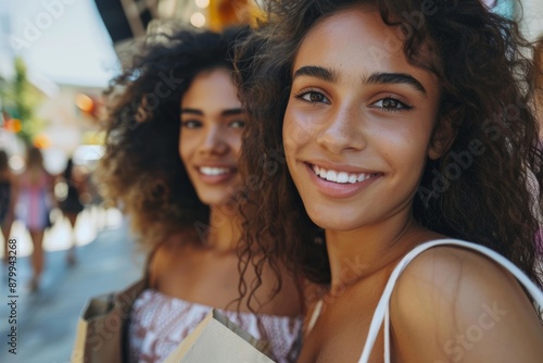Shopping bag, friends, and happy customer portrait in city for retail freedom, quality time, and luxury fashion store. US shopping mall marketing, discount, and black woman smiling
