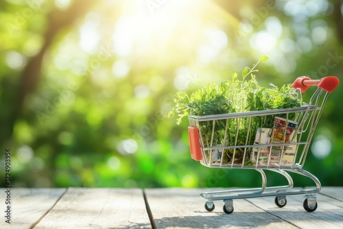 Shopping Cart Filled with Fresh Green Herbs in a Sunlit Garden Setting