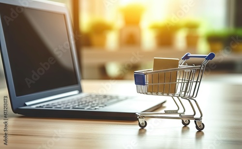 Shopping Cart Model and Laptop on Blurred Home Background. Online Business and E-Commerce Concept