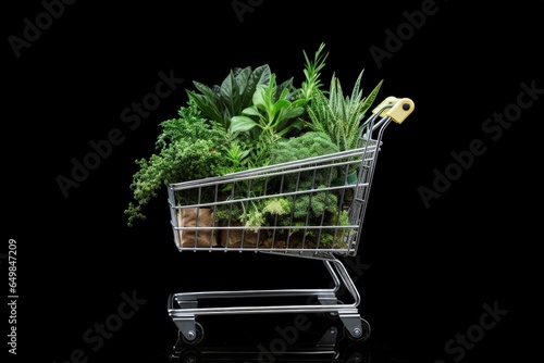 Shopping cart with plants inside, black background. Generative AI