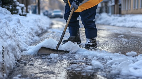 Shoveling snow on winter streets at different times. AI generated image