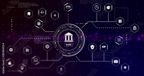 Showing central HUD bank building icon labeled BANK in virtual network with hex icons, nodes, code