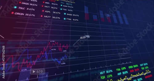Showing financial charts updating on grid interface, with line graphs and ticker percentages