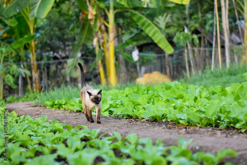 Siamese cat enjoy and relax in garden with natural sunlight. Portrait of blue-eyed siam cat hunting in green garden.