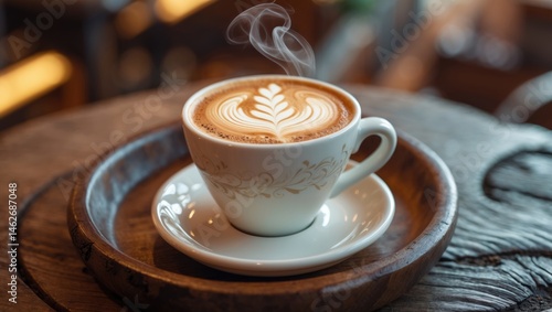Side angle of warm latte coffee with intricate latte art in a white cup resting on a wooden tabletop