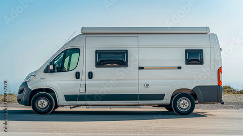 Side profile of a modern camper van, showcasing its sleek design and functionality, ideal for road trips and mobile living adventures in style.