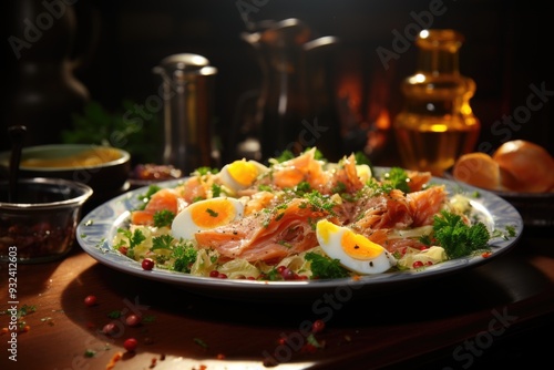 Side sight tuna salad on the plate with eggs, potatoes and eggs on the wooden t, generative IA