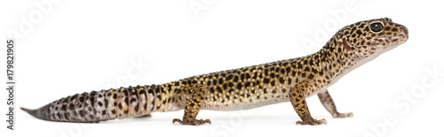 Side view of a Leopard gecko standing, Eublepharis macularius, i