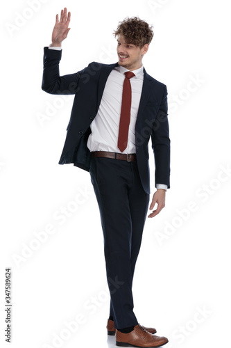 Side view of happy businessman smiling and waving
