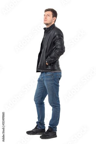 Side view of young casual man with hands in leather jacket pockets looking up serious. Full body length portrait isolated over white background.
