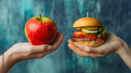 Side-by-side comparison of a hand holding a vibrant apple and another hand holding a burger, illustrating the struggle between healthy and unhealthy eating.