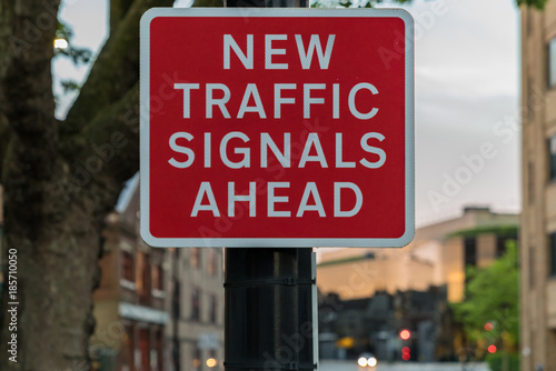 Sign: New traffic signals ahead, with some blurry traffic signals in the background, seen in Ipswich, Suffolk, England, UK