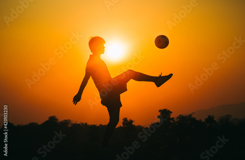 Silhouette action sport outdoors of a young man having fun playing soccer football for exercise in community rural area under the twilight sunset.