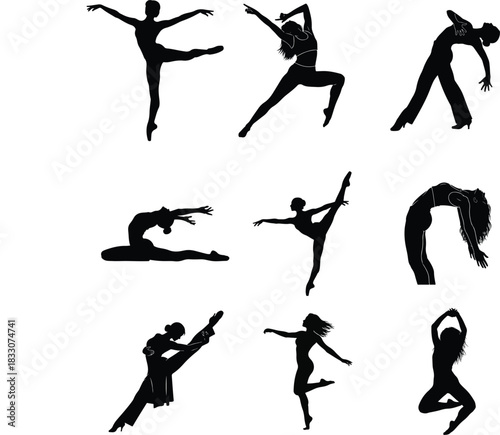 Silhouette collection of nine graceful dancers in various poses, isolated on, showcasing flexibility, artistry, and movement in a minimalist and elegant design