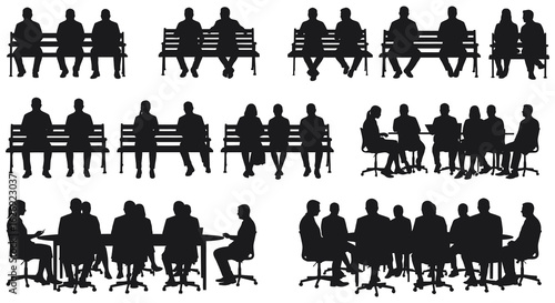 Silhouette Crowd Sitting on Benches and Chairs in Various Arrangements and Groupings