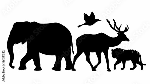 Silhouette illustration of elephant, bird, deer, and tiger on a white background in black color scheme